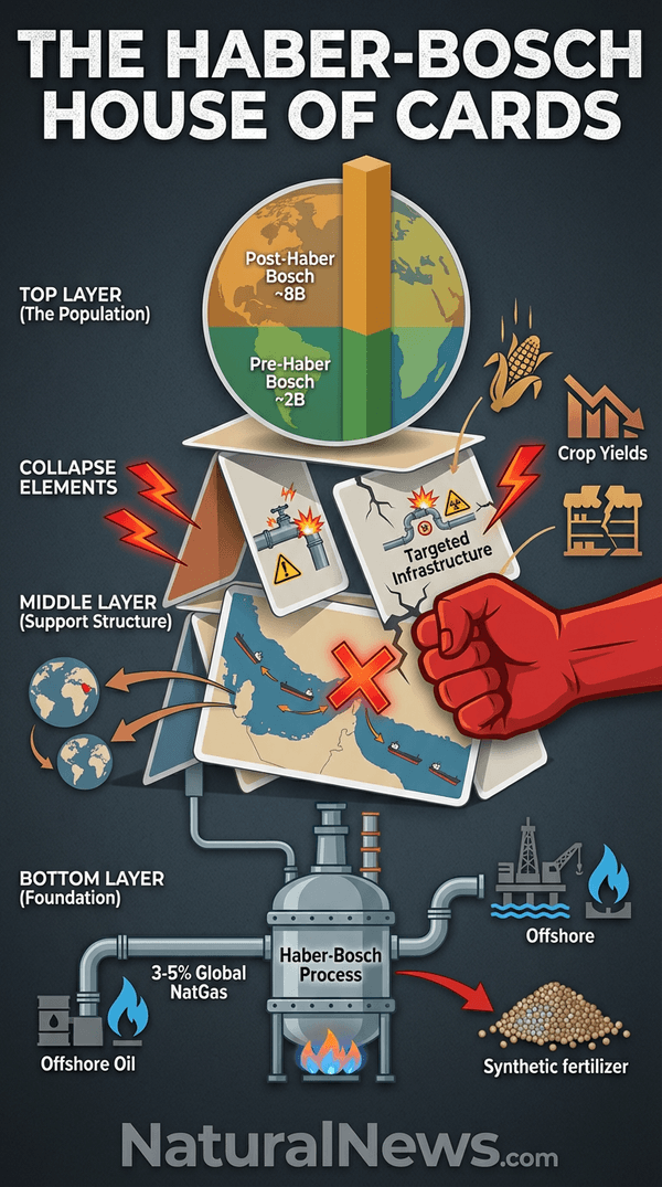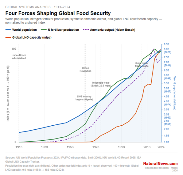 I believe this visual connection isn’t just academic; it’s a flashing red warning sign that half of humanity now exists only because of a single chemical process and the industrial infrastructure that feeds it. We are living on borrowed time and borrowed nitrogen. This house of cards, built on a foundation of natural gas and geopolitical instability, is now being deliberately targeted for demolition. The coming famine is not an accident of climate or war. It is an engineered catastrophe, and the trigger is being pulled as I write this in March 2026.